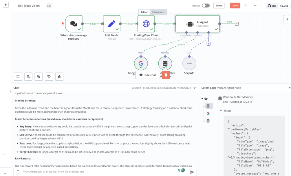 The purpose of this workflow, "Sell: Stock Vision," is to create an AI-powered technical analysis agent capable of analyzing financial charts for equity stocks and cryptocurrencies. This workflow provides users with actionable insights into market trends, price movements, candlestick patterns, and technical indicators to support informed trading decisions.
